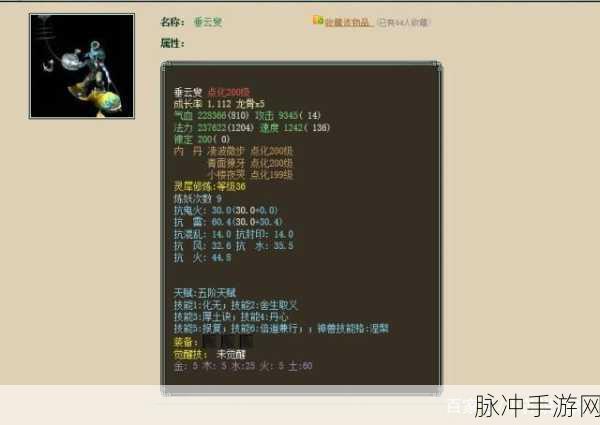 垂云叟,又称鱼老头,以其独特的技能和属性配置,在游戏中扮演着多重角色,其基础属性包括气血、法力、速度、攻击和防御等,但垂云叟的加点主要集中在气血和法力上,以发挥其最大的战斗效能。