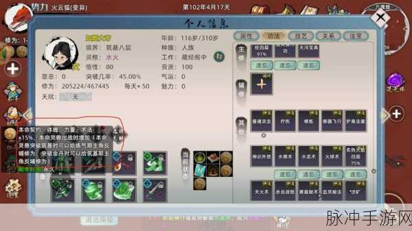 天赋加点同样关键,悟性决定了角色学习新功法的速度和效率,是追求快速成长的不二之选,神魂则关系到角色的精神力量和意志力,对于抵抗心魔、提升修炼境界有着不可忽视的作用,突破率则是决定角色能否顺利突破境界的关键因素,在资源有限的情况下,体魄和术法可作为次选天赋,分别提升生命值与防御力,以及法术攻击力与技能效果。