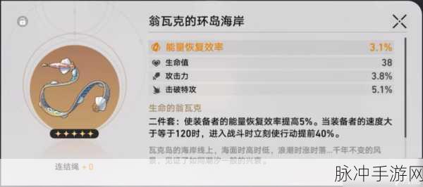 生命翁瓦克套装由翁瓦克的诞生之岛和翁瓦克的环岛海岸两件组成,是《崩坏:星穹铁道》中一套极具特色的遗器,其套装效果为:使装备者的能量恢复效率提高5%,当装备者的速度大于等于145时(部分资料为120,以实际游戏内效果为准),进入战斗时立刻使行动提前50%(部分资料为40%,同样以游戏内效果为准),这一效果对于依赖大招输出的角色来说,无疑是一个巨大的提升。