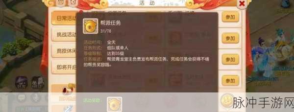 帮派任务是《梦幻西游》手游中每个帮派成员都可以参与的日常活动,任务内容多样,包括帮派巡逻、与门派首席弟子切磋、药品购买、拜访NPC、挑战帮主分身、消灭指定数量的怪物等,这些任务以十次为一环,一环任务完成后,玩家可以获得逐渐递增的经验、银币及帮贡奖励,值得注意的是,每个帮派成员每周最多可以完成70次帮派任务,这是获取帮贡的主要途径之一。